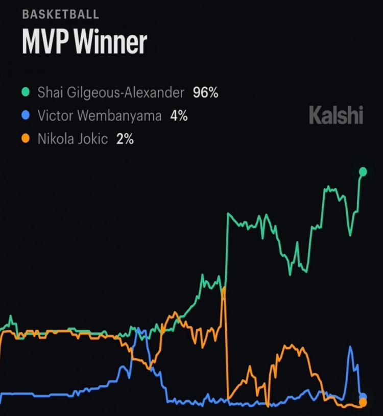 锁了?本赛季常规赛MVP概率:亚历山大上升至96% 文班4% 约基奇2%